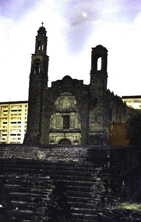 Tlatelolco today is the Plaza of the Three Cultures. It contains the excavated ruins of the great pyramid, second largest in the city, and one of the oldest colonial churches, dedicated to Santiago (Saint James), patron saint of the conquistadors, who would charge into battle yelling "Santiago, and at 'em!" And it is surrounded by modern office buildings and government-built housing projects named for important dates in Mexican history.