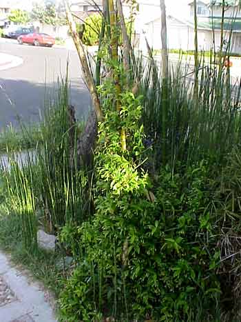 Some years ago I planted this sweet smelling jasmine in a big planter, and now it has spread into the surrounding area. I've encouraged it to grow up one side of the arch, and also up this piece of bamboo. It already smells a bit. In another month it should be intoxicating. I remember one night long ago, on the hillside that descends from UCLA's Royce Hall, the smell of jasmine... Click here to see jasmine three weeks later in full bloom (5/14). |
