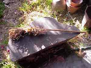Last year a thin bamboo (they all come from the same one plant...why are some thick and some thin?) tried to grow where I didn't want it to grow, in an area that I didn't really want to disturb, so I chopped it off at about 4 feet. Later, I cut it off at ground level, and in one of those "Eureka" moments, I invented the broom. I bound the side branches together with one of those tie wraps that keep supermarket produce neat and tidy, clipped the edges even, and voila! It's actually been quite a useful little outdoor broom, better than a whisk broom for many purposes. And it still works. This year I'll try to make another. Let's see if I can do on purpose what I did by accident. |