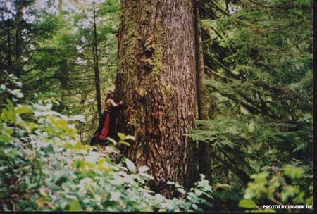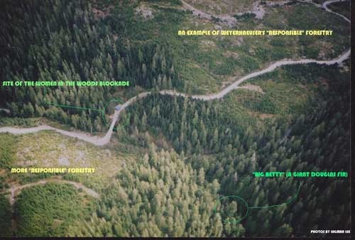 Here's a picture of me hugging 'Big Betty' which is amongst the top ten biggest Douglas fir trees on the planet. (33 ft. cbh) I discovered 'Big Betty' in the Walbran Valley on Vancouver Island BC, while supporting the 'Women in the Woods' 2003 blockade of the American Logging Giant, Weyerhaeuser. The tree is named after Betty Krawczyk, who spent 10 months in prison for her participation in that blockade. 'Big Betty' is situated in an area proposed for logging by Weyerhaeuser. We want Weyerhaeuser to just Fuck Off and die! They do what giant USA corporations do outside of their borders, -invade, occupy and massacre!