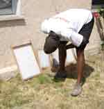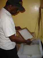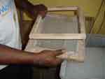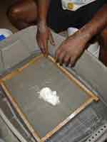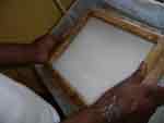 OK, now the frame. A mesh fabric stretched over wood. And another one, just an open rectangle. He holds them together, puts it into the tup vertically and rolls to horizontal. Then lifts. The water drains off, leaving a flat film of pulp with randomly embedded plant parts. This will be paper.